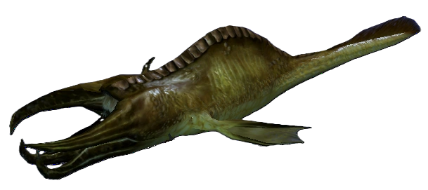 Grande criatura aquática assustadora, mas controlável; pode ser distraída com comida para Lara interagir com alavancas submersas.